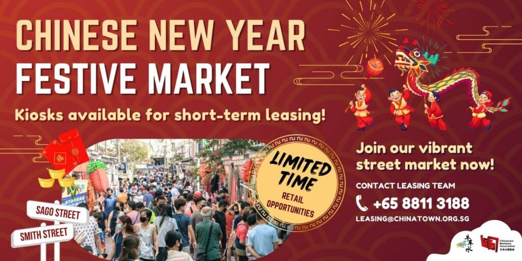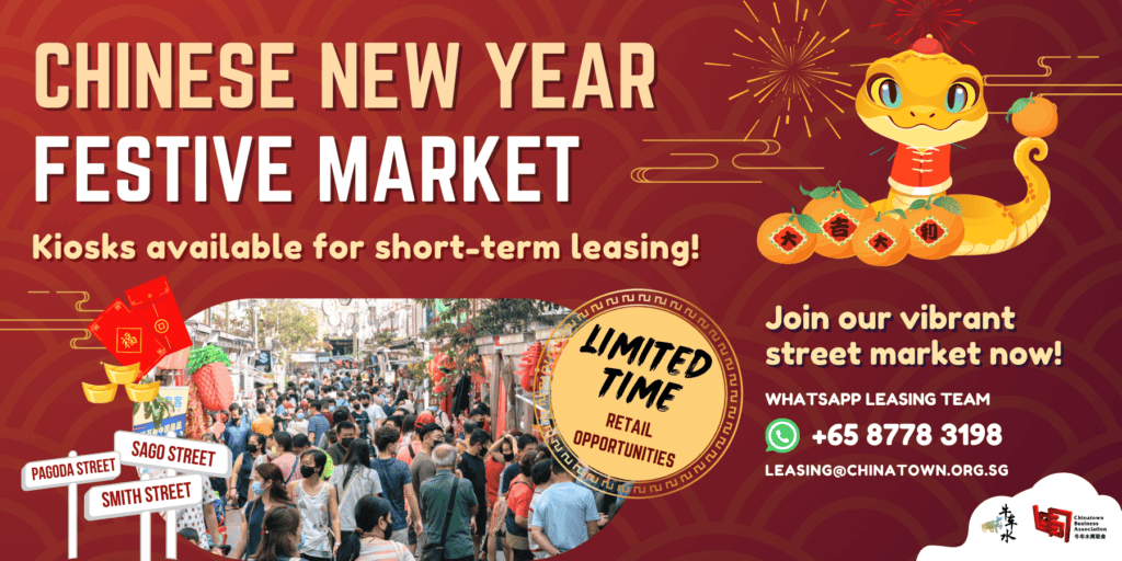 CNY is around the corner everybody! As the hottest place for Chinese New Year shopping in Singapore, we are excited to invite all vendors to join us at our vibrant Chinese New Year festive market on Sago Street and Smith Street during this festive season. Come enjoy the CNY atmosphere and the crowd here! There are limited kiosks for this perfect retail opportunity in Chinatown. Hurry up and contact us for more information before the kiosks run out!