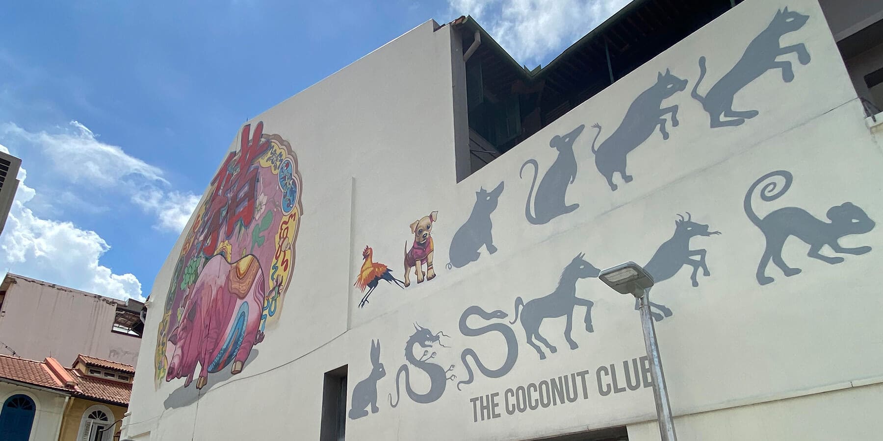 这幅壁画是为新加坡椰子俱乐部设计的,这是一家致力于当地椰子食品, 椰浆饭和珍多冰的时髦联合。 这是一系列向生肖动物致敬的壁画。 这幅壁画将描绘十二生肖的动物,当年的动物会随着年份改变3不时变化。