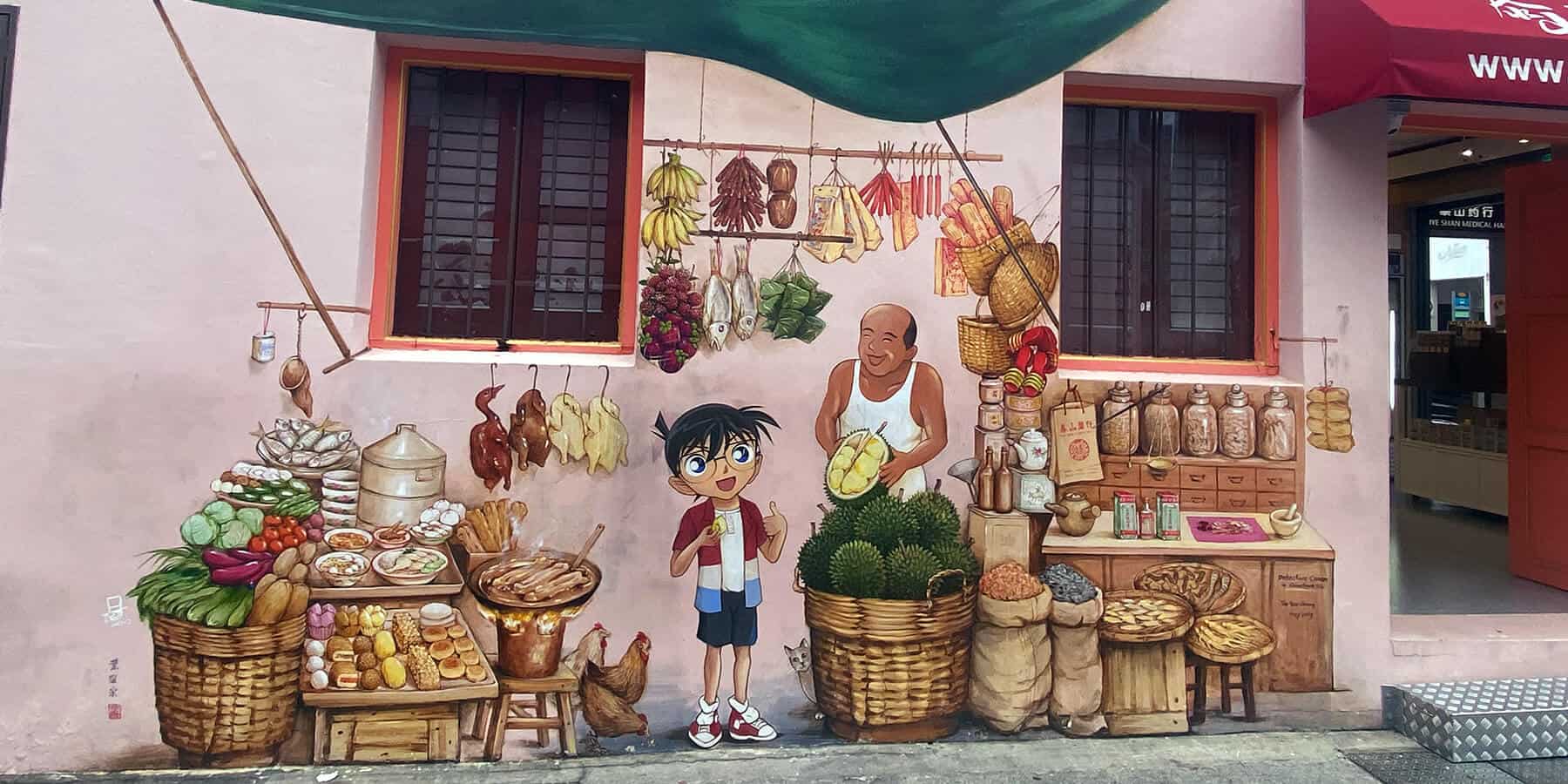 Detective Conan, the Japanese manga character, explores Singapore Chinatown’s streets and comes across a traditional store selling fruits and dried goods. Durian, the King of the Fruits, gets the thumbs up from him. This mural in Chinatown is by Yip Yew Chong.
