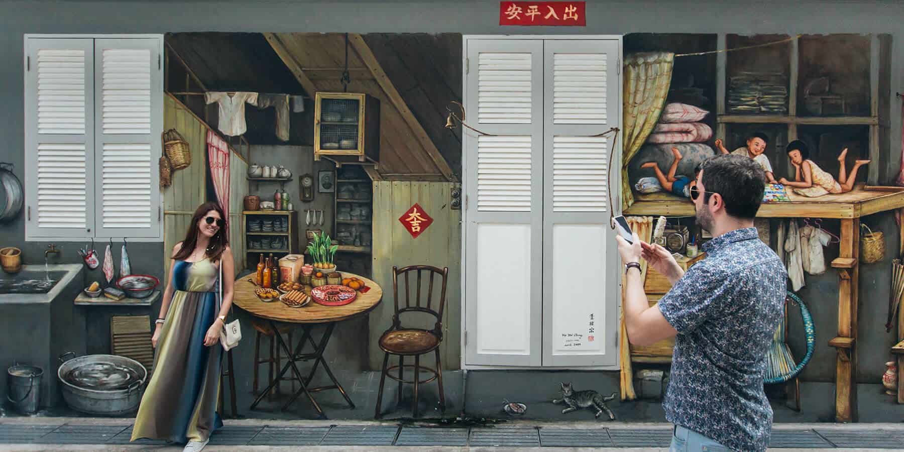 Found in an alleyway between Smith Street and Temple Street, the mural depicts scenes from inside a Chinatown shop house. There are so many details to admire – from the simple wooden platform furniture to the kids playing with a paper sword to the spread of food on the dining table. The 2019 mural evokes plenty of nostalgia and features many household items that were once common place just two or three generations ago.